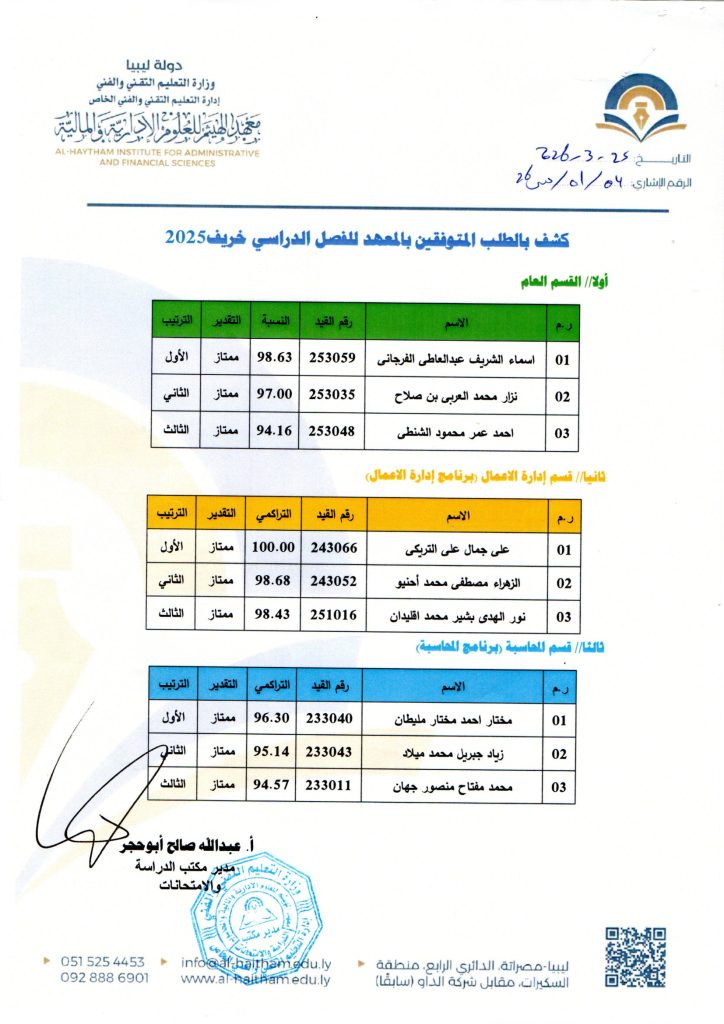 يسرّ إدارة معهد الهيثم للعلوم الإدارية والمالية أن تعلن عن نشر قائمة الطلبة المتفوقين للفصل الدراسي خريف 2025، تقديرًا لجهودهم المتميزة وعطائهم المستمر في سبيل تحقيق النجاح والتفوق